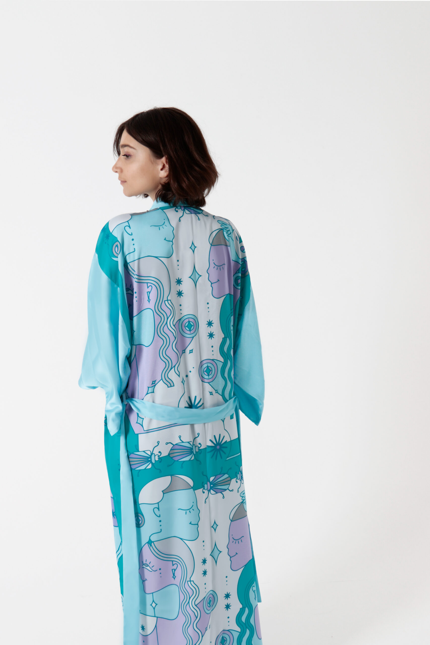 Exclusively handsewn silk kimono MOMO, with unique hand drawn pattern, for those who want to outstand, shine and sparkle, who want to add colors and joy to their and their loved one’s life.  To enjoy summer with soft silk, airy, smooth and gorgeous look.