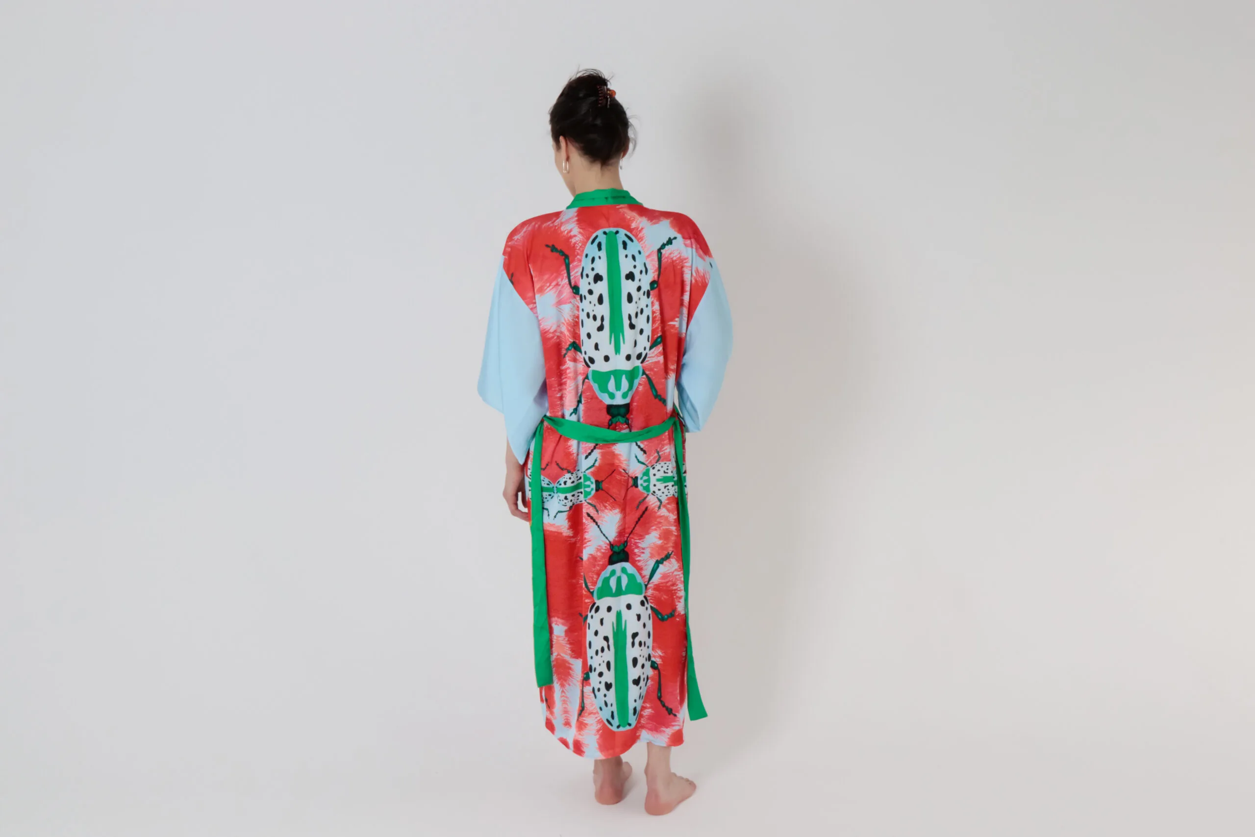 Exclusively handsewn silk kimono MOMO, with unique hand drawn pattern, for those who want to outstand, shine and sparkle, who want to add colors and joy to their and their loved one’s life.  To enjoy summer with soft silk, airy, smooth and gorgeous look.