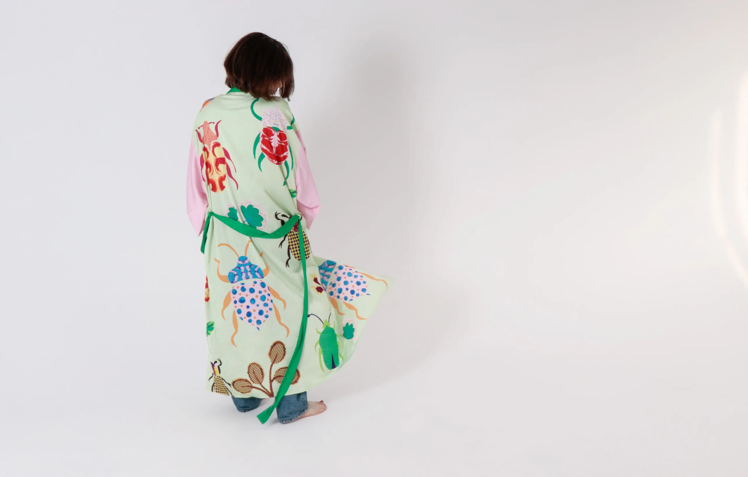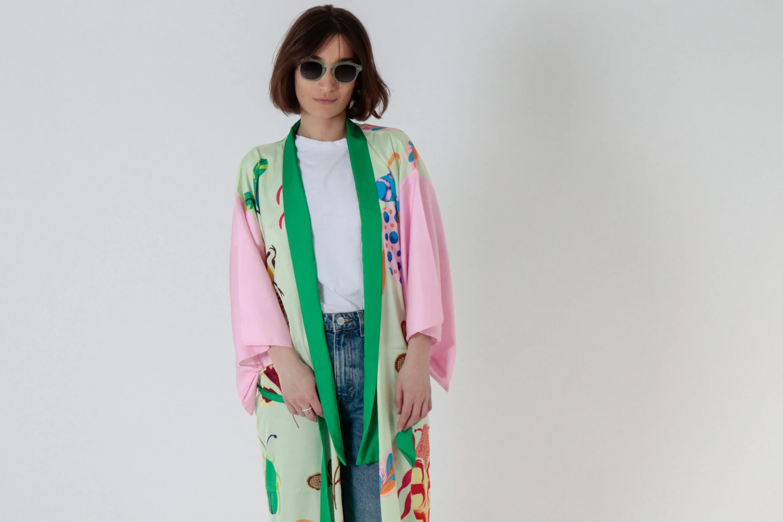 Exclusively handsewn silk kimono MOMO, with unique hand drawn pattern, for those who want to outstand, shine and sparkle, who want to add colors and joy to their and their loved one’s life.  To enjoy summer with soft silk, airy, smooth and gorgeous look.