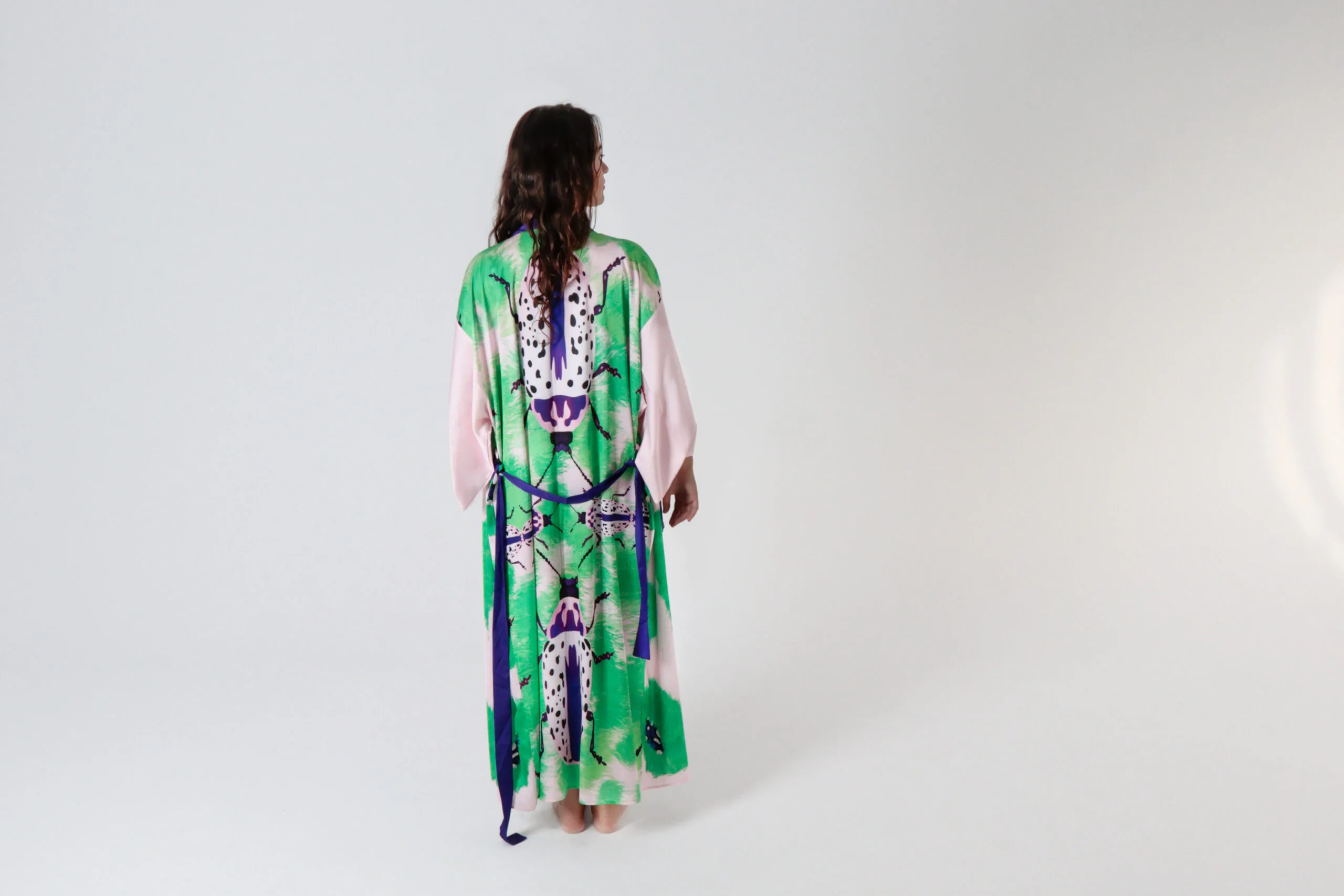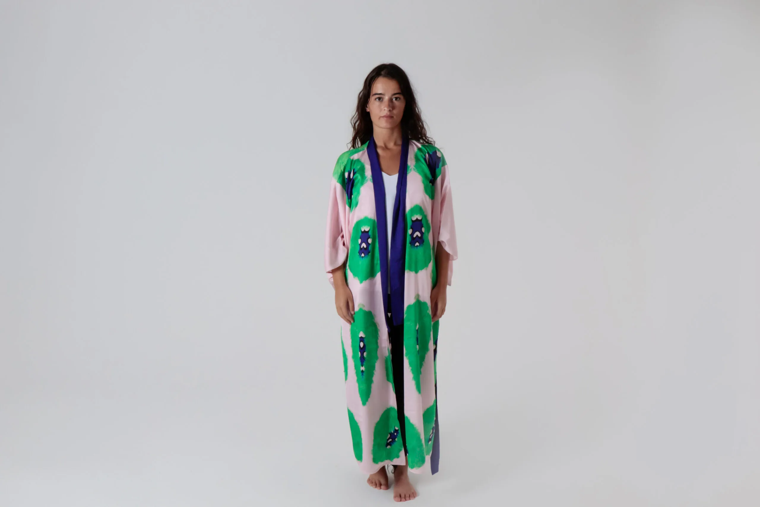 Exclusively handsewn silk kimono MOMO, with unique hand drawn pattern, for those who want to outstand, shine and sparkle, who want to add colors and joy to their and their loved one’s life.  To enjoy summer with soft silk, airy, smooth and gorgeous look.