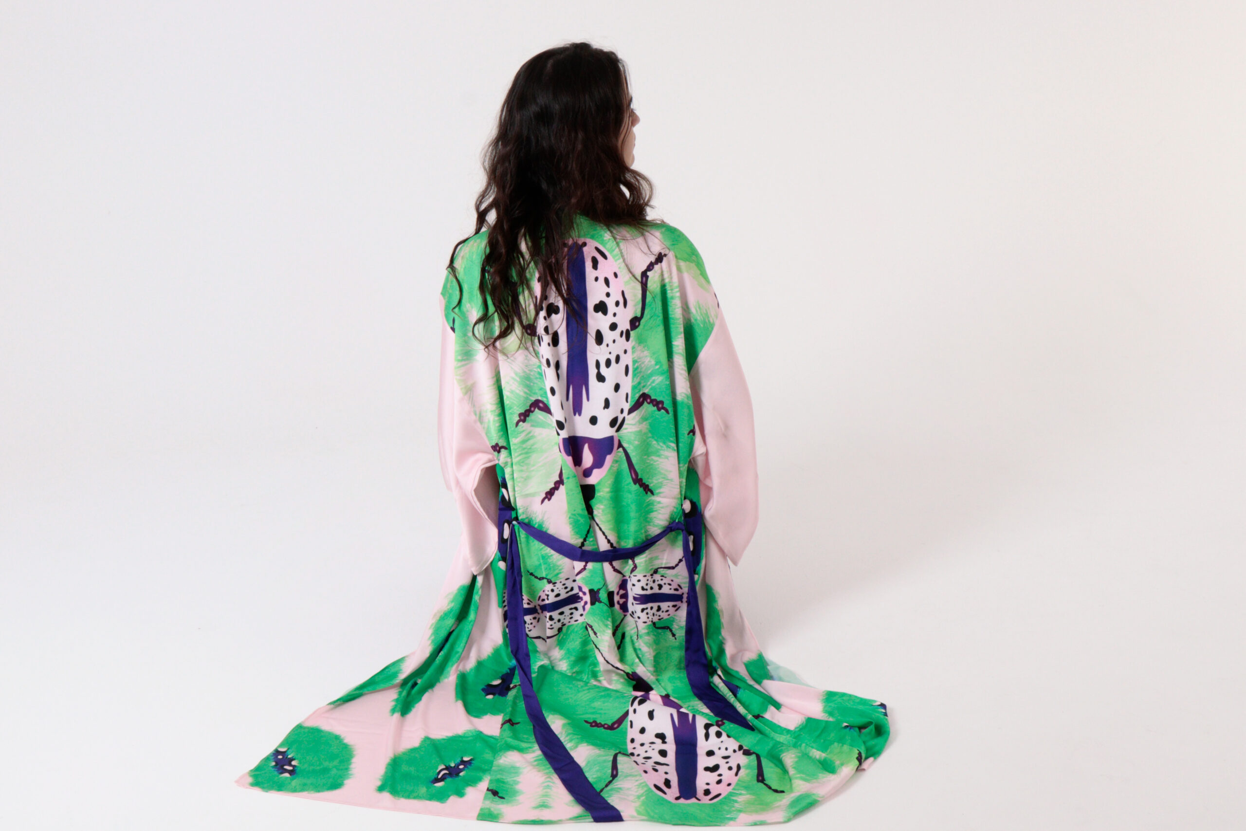 Exclusively handsewn silk kimono MOMO, with unique hand drawn pattern, for those who want to outstand, shine and sparkle, who want to add colors and joy to their and their loved one’s life.  To enjoy summer with soft silk, airy, smooth and gorgeous look.