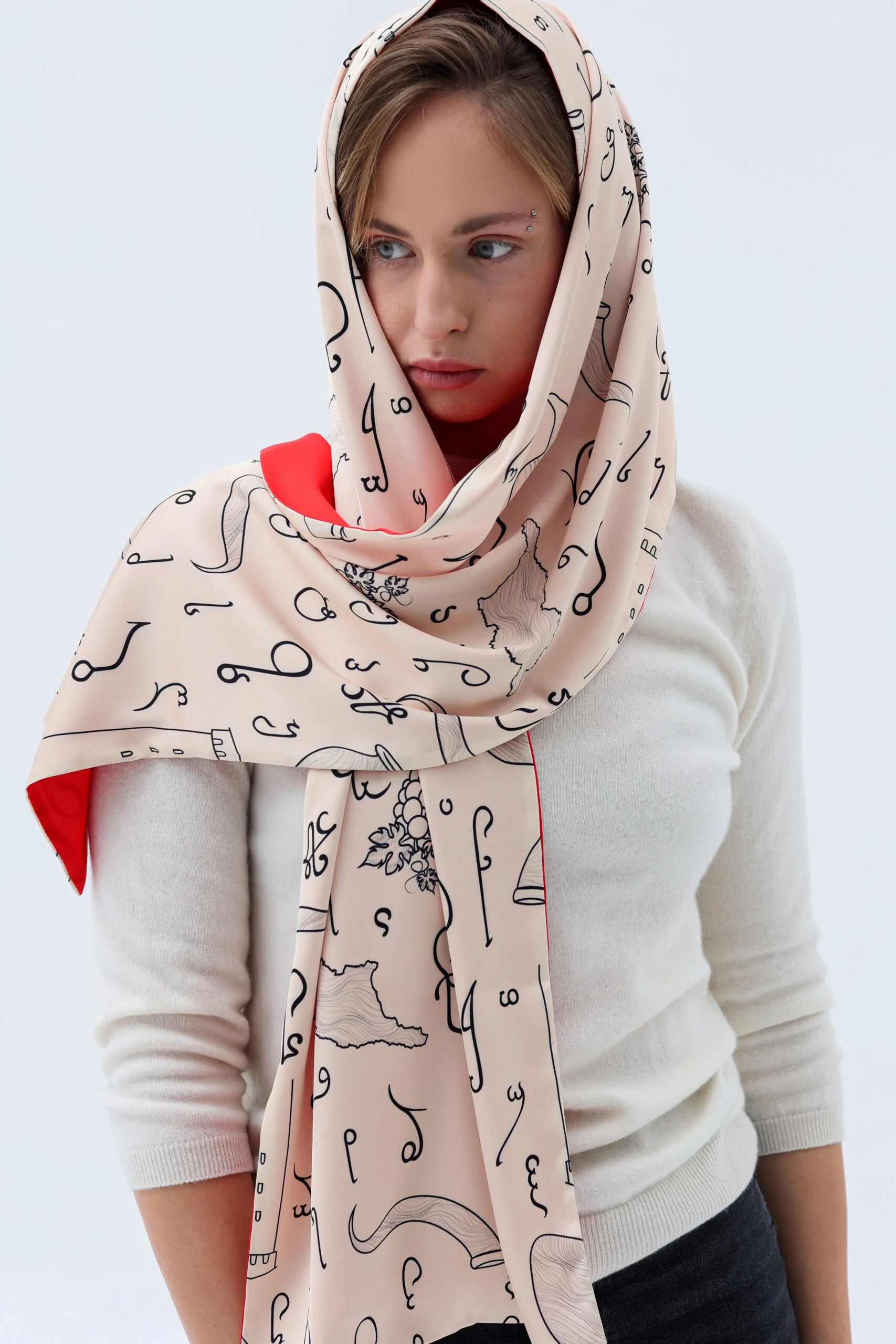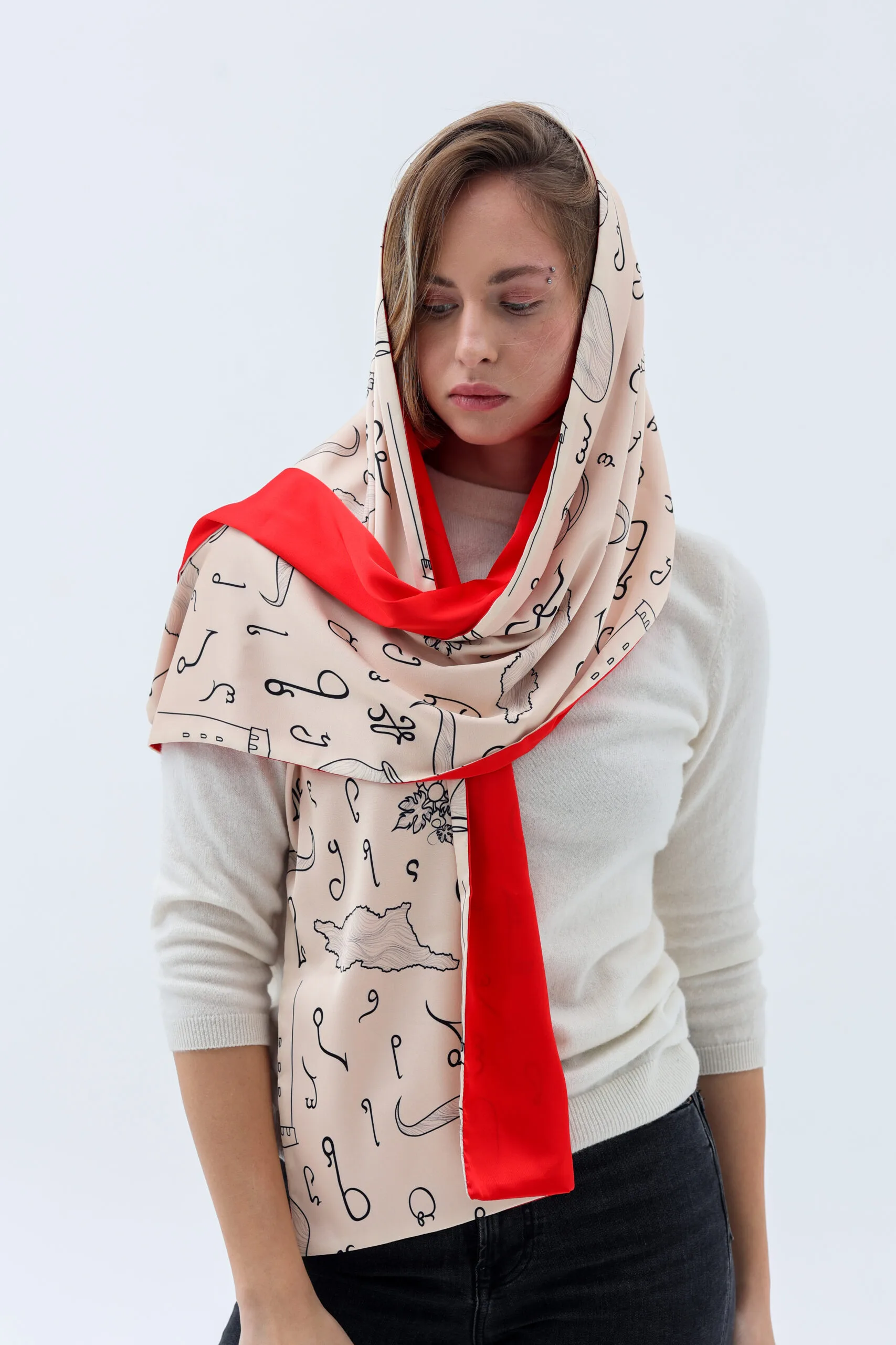 An exquisite, soft, airy and smooth silk double-sided scarf with a unique Georgian alphabet, created with hart.